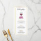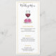 A 4" x 9" wedding menu featuring watercolor pink hydrangeas and a glass of red wine, elegantly framed in gold. The menu includes options for Hors D'oeuvres, Entrées, and Desserts, and the reverse side is customizable with the bride and groom’s names.