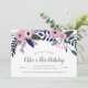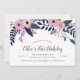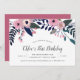 Os convites de aniversário florais chicos para o primeiro aniversário, aniversários de criança ou qualquer idade, apresentam uma borda superior em cascata de flores cor-de-rosa pinceladas com um verde botânico exuberante. Personalize com seus detalhes de festa de aniversário em serifa escura e letras de caligrafia.