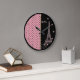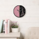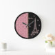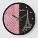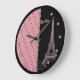 Este relógio rosa redondo parecerá excelente em qualquer cômodo da sua casa. Ele tem a Torre Eiffel nela e uma design cor-de-rosa.