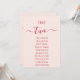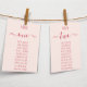 In the upper part, there is the table number written in a handwriting script and the word Table above, in smaller caps (hand letters). Under them, there are the 10 guest names, in similar hand letters. All text is red, the background is blush pink.