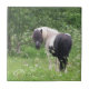 Fotografia de um pônei preto e branco parado em um campo de grama e flores silvestres.