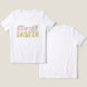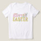 Camiseta Felz pascoa personalizada, tenda e fofa, escrita à mão, com coelho pintado à mão, pintinho, flores, ovos decorados e cenouras em cores vibrantes e primavera. Arte original de Leslie Larson.