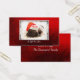 Um cartão de visita de etiqueta de presente que diz: Um presente para você. Com seu nome e as palavras: Love & Pugs escrito no verso. Ilustrado com uma foto adorável de um filhote de cachorro dormindo enquanto veste um chapéu de santa. Feliz Natal está escrito na banda de seu chapéu, com uma letra manuscrita na moda. Uma borda cinza com luzes coloridas de Natal cercando a moldura dessa foto fofinha. Fundo é uma imagem abstrato vermelha.