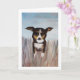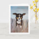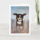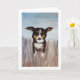 Um cachorro amigável brincando na grama alta é uma ótima maneira de dizer olá. Transfira facilmente esta pintura acrílica para outros cartões e presentes. As cores azul, bege, marrom e caramelo são lindas como cartão de agradecimento, cartão de aniversário ou apenas para sua papelaria pessoal.