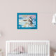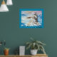 Uma pintura elegante e adorável de um cavalo branco no meio do mar ondas em tons de azul com um céu rosa. de minha coleção de animais. Esta poster tem uma estrutura azul.