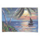 Duas palmeiras litorais e um veleiro no oceano no por do sol com pássaros e flores. Paisagem acrílica da pintura do seascape bonito de uma praia tropical das caraíbas. Pintado à mão tradicional original por Donna Leger para o design ©irony