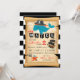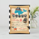 Baleia pirata e peixe-estrela com rolagem de mapa antiga e design de convite de aniversário de estrias negras e brancas.