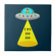 Este incrível azulejo de Natal apresenta uma imagem de arte digital de uma espaçonave de alienígena decorada com luzes de Natal brilhantes e coloridas. Dentro o OVNI olhando pela janela há uma alienígena verde com olhos pretos vestindo um chapéu festivo de Santa. Há um cone de luz vindo do disco voador. A sombra de uma mensagem está sendo projetada para a Terra. A mensagem diz Ho Ho OVNI. Cartões de natal do espaço exterior para todos os terremotos.