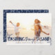 Perfeito para aqueles que vivem em climas tropicais, ou por compartilhar uma foto favorita de férias na praia, nosso cartão com fotos de feriado costeiro apresenta "Dashing Through the Sand" como uma rica camada de texto azul marinho adornada com ilustrações estreladas. Personalize com seus nomes e saudações personalizadas (mostradas com "desejos mais quentes") na parte inferior. Cartões invertem para um padrão de estrelas brancas no marinho costeiro.