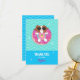 Estes cartões de agradecimento personalizados apresentam uma ilustração de Sophie, uma personagem de desenho animado de cão, relaxando no seu bote de piscina inflável em forma de donut. Sophie é um cachorro marrom e branco vestindo um maiô de abacaxi. Ela está vestindo óculos escuros. O flutuador inflável da rosquinha tem um glacé rosa brilhante com borrifagens coloridas em verde-menta, roxo, amarelo e rosa escuro. O adesivo tem design de linha ondulada e sotaque de brilho. "Obrigado" está em uma fonte em forma de balão, e a parte de assinatura do nome está em rosa.