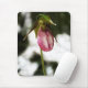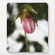 Uma fotografia de perto de um Slipper de Senhora rosa que cresceu à sombra de uma árvore.