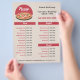 Um panfleto de menu e lista de preços para seu restaurante pizzeria, caminhão de comida, serviço de comida de entrega de casa ou chefe de cozinhar. É constituída por uma pizza com pepperoni, azeitonas e manjericão colocados num conselho de madeira e um semicírculo vermelho. Você pode distribuí-los aos seus clientes ou em caixas de correio.