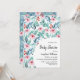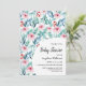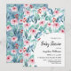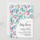 Cartão de convite de chá de fraldas plano com imagens adoráveis de plantas aquáticas com esmeraldas e folhas azuis, galhos e flores rosadas macios.