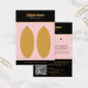A placa de exibição de joias moderna do Dangle tem uma série de variações a escolher, rosa, azul, bege e e branco. A faixa superior preta, frente e verso, mostra o nome da marca, o site na parte inferior da faixa preta frontal enquanto na parte traseira estão o local de negócios, o contato, a alça social e o código QR; o fundo rosa frontal médio destaca duas ovais para certos tipos de brincos, como o perigo, a queda ou quaisquer brincos longos; e no fundo, o mesmo fundo cor-de-rosa na parte frontal é a descrição do produto e a joalharia.