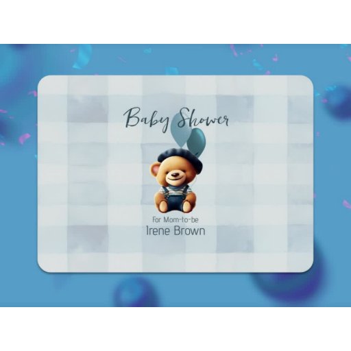 Crie um gabinete de chá de fraldas único com cores azuis, e um ursinho cônico casual com gingham e balões. A frente inclui o nome do evento e convidado de honra. O dentro tem uma solicitação de livro para bebês que você pode editar. Urso Jean Baby design. Use a modelo para personalizar.
