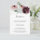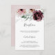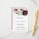 Este cartão de recepção de casamento de romance floral é perfeito para um casamento elegante. A moderna design do bico rústico apresenta flores românticas a aquarela em tons macios de burgundy, mauve, rosa-pincel e branco-creme com folhas verdes. Personalize este cartão de recinto detalhado com as informações de recepção e inclua também o endereço do seu site de casamento!