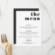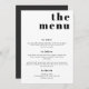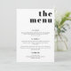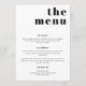 Este menu apresenta uma fonte serif ousada e uma design minimalista moderna. Use este modelo para editar as fontes, a cor da fonte e a cor do plano de fundo para corresponder às suas necessidades de evento.Este menu faz a adição perfeita ao seu simples chá de fraldas contemporâneo, retrô ou boêmico, chá de panela, casamento, aposentadoria ou qualquer outro evento! Este menu de mesa apresenta uma combinação simples de cor branca e preta, mas todas as cores são 100% editáveis para corresponder ao seu estilo.