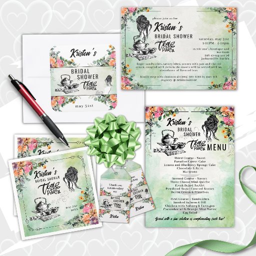 Você não pode ter uma festa de chá de chá de panela elegante sem um menu de chá de panela. Temos você coberto com esta adorável carta de tamanho excessivo que retrata uma bandeja formal de serviço em três níveis no fundo com os itens tradicionais de três campos já em vigor. Atualize facilmente o texto para o que você escolher para servir no seu evento especial. A parte superior mostra a cabeça da nossa linda noiva em perfil com o bule de chá tradicional e xícaras de chá. Certifique-se de atualizar o nome no topo também!