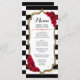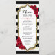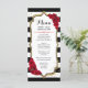 Cartão de Menu. Design vermelho preto clássico com ouro brilhante. O Floral design apresenta faixas pretas e brancas, fontes de script e rosas vermelhas. Perfeito para uma festa elegante.