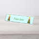 Esta placa de escrivaninha mostra um bonito Anjo de Natal com cabelo louro, olhos azuis e um sorriso grande. O corpo dela é um sino verde festivo e vermelho, com um aplauso amarelo no fundo.