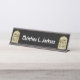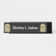 Esta mesa ou placa de nome pendurada é preta com gaiolas de pássaros dourados com um pássaro sobre um galho com vista para uma cabana coberta de neve por um dentro de córrego em cada extremidade. Personalize seu nome com o modelo.