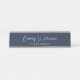 Placa de nome de mesa azul profissional e elegante com seu nome mostrada em um script de assinatura branca moderno e em sua empresa ou título em letras brancas simples.