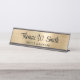 Uma placa moderna de identificação profissional com seu nome em um script de na moda em um fundo metálico de buracos de ouro. Adicione o seu título à tipografia simples.
