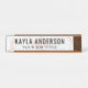 A placa moderna de nome da mesa inclui o nome do funcionário e o título profissional do cargo em textos elegantes e na moda com um fundo tradicional no estilo de mármore branco com sotaques rosa dourados. Pode ser totalmente personalizado com seu texto e cor personalizados e sua escolha de cor de quadro.