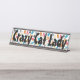 Esta placa de nome de Senhora de Gato Louco, personalizável, tem um fundo branco com hipsteres em cores coloridas.