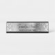 Brilhante prateado cintilante, cintilante, nas bordas laterais, sobre uma fina cinza prateada, em metal escovado ou em papel fotográfico do estilo aço inoxidável. As cores principais são cinzas prateadas, pretas e brancas. Placa personalizada de desktop com espaço para nome e cargo. O estilo e o tamanho da fonte podem ser alterados, se necessário.