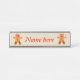 Esta placa de escrivaninha mostra um desenho fofo de um homem colorido de pão de gengibre. Ele tem botões vermelhos e verdes, um sorriso grande no rosto e bruxas vermelhas e verdes em volta de suas pernas prontos para uma festa de Natal.