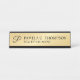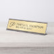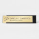 Faça sua empresa parecer mais profissional com uma placa moderna de nome preto e de mesa de ouro. Esta placa de nome da mesa apresenta um monograma no estilo de fonte preto moderno de script com nome e título no estilo de fonte de serif profissional preto no fundo dourado. Perfeito para agente imobiliário, consultor, contabilista e muitas outras profissões. Nota: Os detalhes da folha são simulados no trabalho de arte. Não será utilizada nenhuma folha de alumínio real no fazer deste produto.