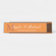 Uma placa de nome elegante com sua inicial em laranja queimada contra um fundo laranja sob seu nome e título em branco.