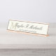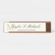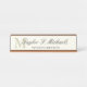 Uma placa de nome neutra e elegante com sua inicial em um ouro pálido contra branco cremoso sob seu nome e título em tão marrom escuro que é quase preto.