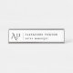 Uma simples placa de nome preto e branco com nome do funcionário, título profissional e monograma.