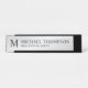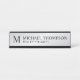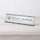 Faça seu negócio parecer mais profissional com uma placa de nome preto e prateado. Esta placa de nome da mesa apresenta um monograma com nome e título no estilo de fonte de serif profissional preto em fundo prateado. Perfeito para agente imobiliário, consultor, contabilista e muitas outras profissões. Nota: Os detalhes da folha são simulados no trabalho de arte. Não será utilizada nenhuma folha de alumínio real no fazer deste produto.