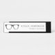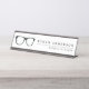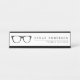 Uma placa de identificação engraçada e ligeiro contudo profissional da mesa que caracteriza um par de vidros retros do espetáculo seguiu por seu nome em uma pia batismal clássica do estilo ao lado dela.