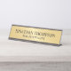Esta placa de nome da mesa apresenta o nome e o título no estilo de fonte de serif profissional preta em fundo ouro.