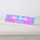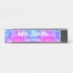 Este nome de mesa de professor de arte tem um padrão abstrato azul e roxo. O design pode lembrá-lo de gravata.