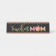 Placa de nome de mesa bonita e divertida para mães escolares. O design apresenta "Professora Mãe" com a letra "O" desenhada para parecer uma maçã com monograma personalizado. Um design de régua é colocado no topo contra um fundo preto para representar um quadro preto.