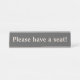 Este design tradicional mostra a mensagem "Por favor, sente-se!". Esta poderia ser utilizada numa área de recepção para informar os visitantes, clientes ou clientes de que serão assistidos em breve e de que deverão, entretanto, ter assento.