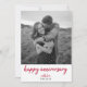 Cartão com fotos simples, na moda, "Feliz Aniversário" em uma tipografia moderna vermelha profunda e minimalista e complementar "com amor" no estilo correspondente. Seu nome e sua mensagem de dentro podem ser facilmente personalizados para uma placa única com um toque pessoal! A carta mostra uma imagem exemplar de um casal romântico e amoroso que sai em uma caminhada pelos campos e colinas. Ela tem cabelos vermelhos ondulados com comprimento de médio e está vestindo um vestido padrão e ela parece muito feliz e contente. Ele tem os braços à sua volta e está beijando-a carinhosamente na bochecha, ele tem cabelo curto e está vestindo uma jaqueta de denim. A imagem de marido e mulher é fotografada em preto e branco monocromático de sépia para um olhar clássico. Esta imagem foi concebida como um marcador de posição para ser substituída pela sua fotografia ou imagem de família favorita.