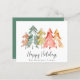Cartão de Natal elegante e econômico, com um abstrato de cor d'água de pinheiros em verde-cinza, vermelho, ouro e laranja e "Felizes Feriados" em um roteiro de na moda. Adicione uma saudação sazonal personalizada e seus nomes em um script semelhante a assinatura no verso.