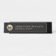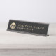 Eleve sua mesa com esta luxuosa placa de nome preto e de mesa dourada com um emblema de metal redondo escovado e o nome no texto do ouro sobre um fundo preto sólido. A adição perfeita a qualquer ambiente profissional.
