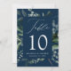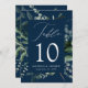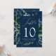 Cartões de mesa de casamento elegantes e botânicos com o número da tabela, seus nomes e data de casamento aninhados em um quadro retangular cercados por eucalipto, samambaias e outros ricos verdes com fundo marinho. Personalize o número de cada placa de mesa e adicione-o ao seu carrinho. Os cartões de mesa 5x7 foram projetados para coordenar com nossa coleção de casamento Abundant Greenery.