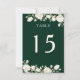 Cartão Elegante de Número de Tabela com glândulas florais de creme e rosas brancas em um fundo verde da floresta esmeralda escuro. A coordenação de papelaria e decoração de festas está disponível na minha Coleção Princesa de Vestidos e Rosas Quinceanera, mas por favor, envie-me uma mensagem se precisar que eu acrescente outros itens.