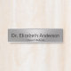Este sinal de porta de aparência de metal escovado tem duas linhas de texto preto. Pode editá-lo para mostrar o nome e a especialidade do médico. A aparência falsa de prata é trabalho de arte (não metal).