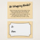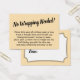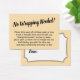 Se você estiver hospedando um chá de exibição sem presentes para uma noiva para ser, este cartão simples e divertido pode ser a escolha para você. Usando uma fonte elegante de script, adicionei primeiro um cabeçalho que dizia "No Wrapping Neanced!" na frente, e "To" e "From" para o lado da etiqueta de presente. O campo de modelo foi criado para oferecer instruções aos convidados que não embrulhassem o seu presente; por favor, sintam-se livres para alterar a redação da forma que quiserem. Há muitos alternativos populares neste texto, se você quiser uma mudança. Todas as fontes e cores podem ser modificadas conforme você vê o ajustado.