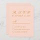 Um simples e minimalista representante de orçamento para um casamento. Ele tem apenas texto sobre fundo rosa-claro. O título RSVP e a letra M são escritos num guião caligráfico elegante, o resto em bonés. Todo texto é ouro.
