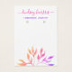 Este cartão de exibição de joias único é decorado com folhagem de aquarela em rosa, roxo e coral. Use um socch para criar os orifícios marcados. Você pode personalizar este cartão com seu nome ou seu nome de loja e detalhes. Para editar mais, clique no link "personalizar mais" e use nossa ferramenta design para alterar o tamanho, a fonte e a cor do texto. Porque nós criamos nosso próprio trabalho de arte você não encontrará essa imagem exata de outros designers. Original Watercolor © Michele Davies.